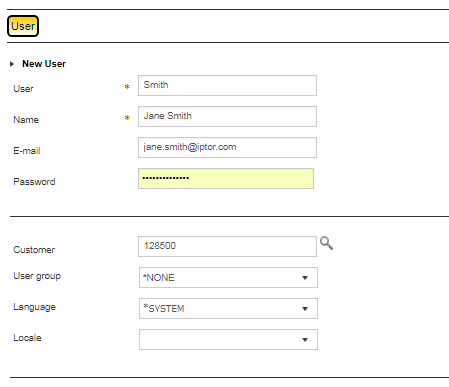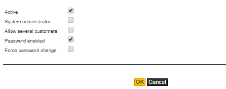 - Select the customer number in Enterprise/DC1 that is associated to this user account. This means that this user will be able to access and change information for the selected Enterprise/DC1 customer number only. If you want this user account to have access to several customers’ data, then check the Several customers allowed box, described below. This will allow you to connect several customer numbers to this user account. (You do this via the Customers push button, which will be available in edit mode after creation of this account.)