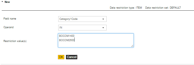 - Enter the applicable values to which this restriction should apply, meaning in this case, the item codes to which you want to assign links. The entries in this field are case sensitive.